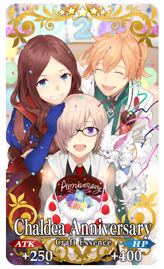 ★★★★★SSR Chaldea Anniversary ATK 250 (MAX: 1000) HP 400 (MAX:1600) Skill Increase Quick Card & Arts Card effectiveness by 8% & begin battle with NP charged at 50% for yourself |