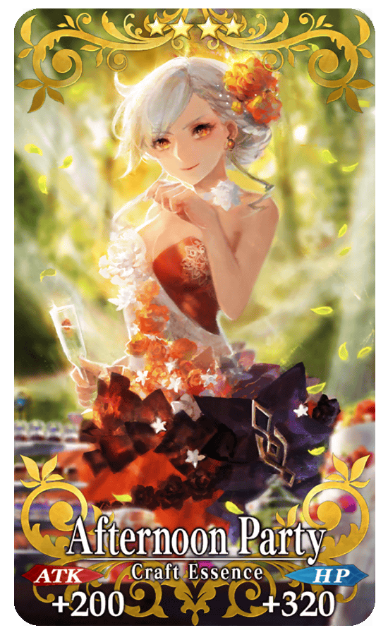 ★★★★SR Afternoon Party ATK 200 (MAX: 750) HP 320 (MAX: 1200) Skill Increase NP Gauge by 4% each turn & Arts Card effectiveness by 10% for yourself |