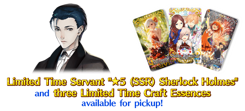 Until 2023-07-02 20:59 PDT(GMT -7), Limited Time Servant "★5 (SSR) Sherlock Holmes" and three Limited Time Craft Essences from 2019's "2nd Anniversary Singularity Pickup Summon (Daily)" will be available for pickup!