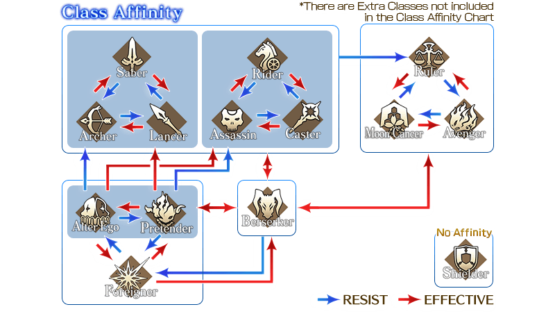 In addition, Pretenders have attack advantage against the "Saber", "Archer", and "Lancer" classes, and attack disadvantage against the "Rider", "Caster", and "Assassin" classes.