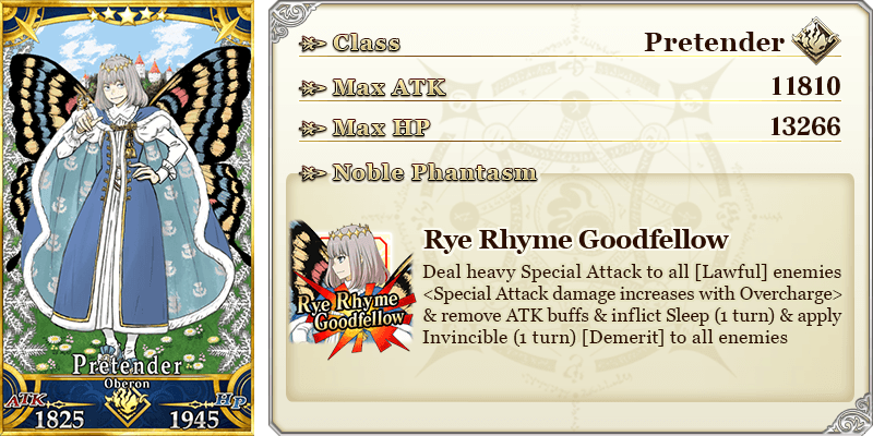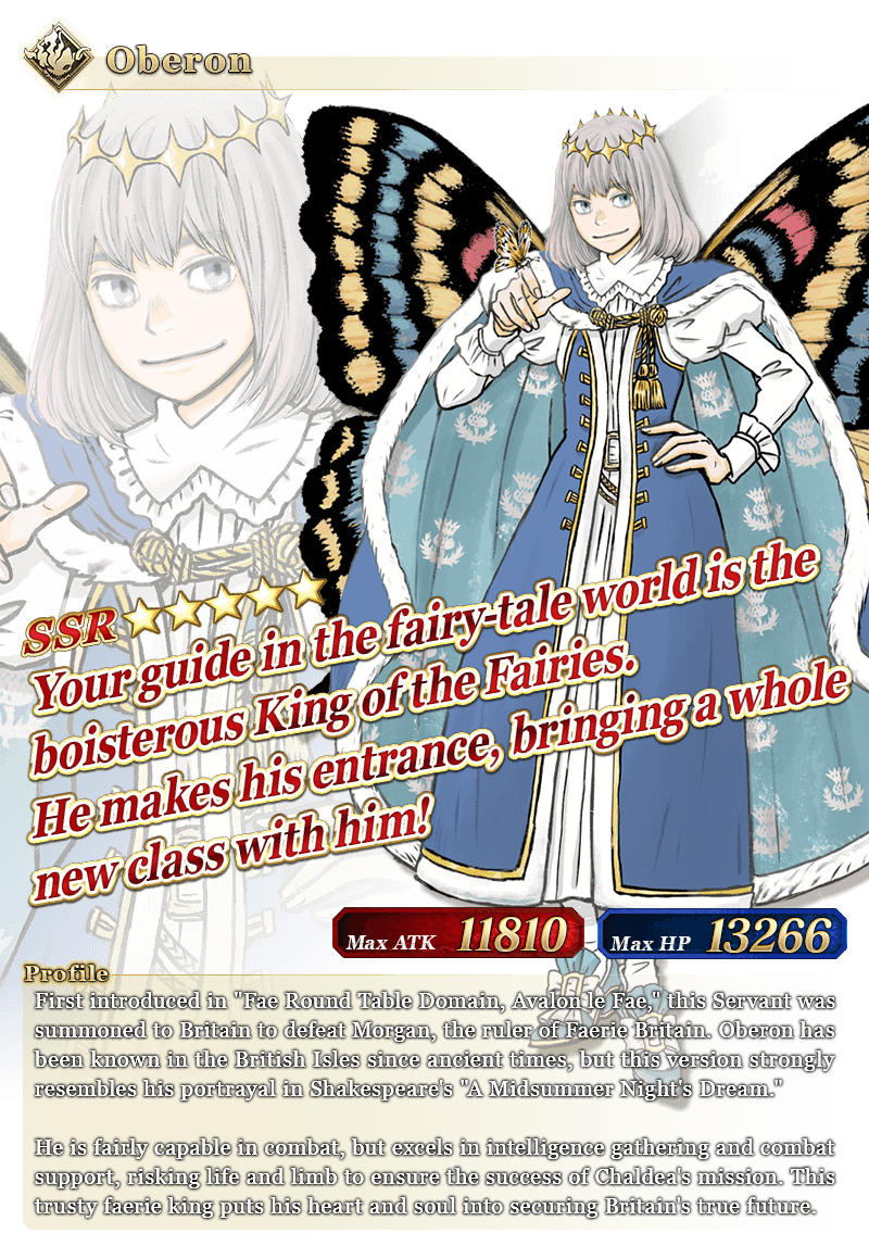 * The Noble Phantasm name and animations for "★5 (SSR) Oberon" visible at Ascension Level 3 will change once his "Spirit Origin Release Quest" has been cleared.