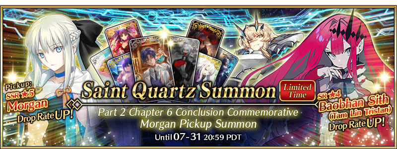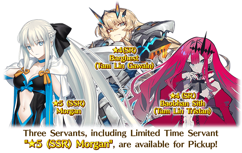 To celebrate the conclusion of Part 2 Chapter 6 "Lostbelt No.6: Fae Round Table Domain, Avalon le Fae - The Moment a Planet Is Born", three Servants, including Limited Time Servant "★5 (SSR) Morgan", are available for Pickup!