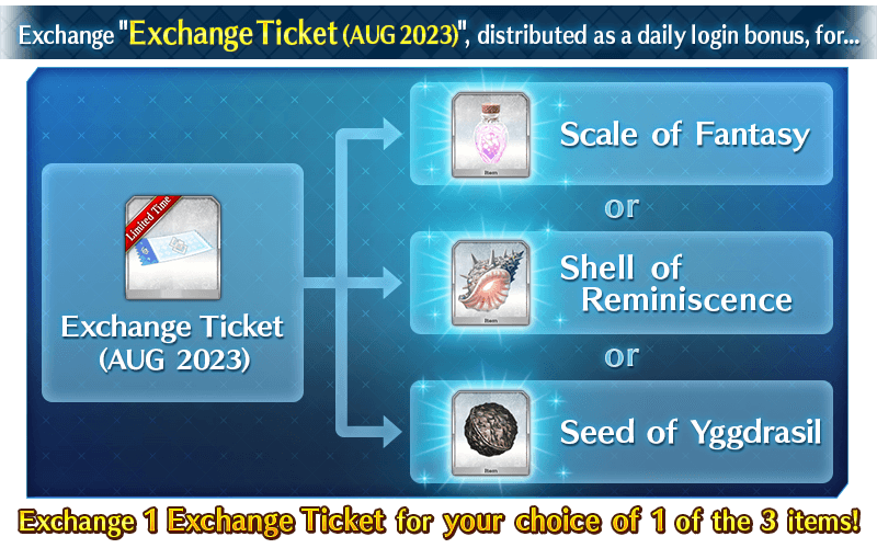 The "Exchange Ticket (AUG 2023)" distributed as a daily login bonus will be exchangeable for the following items.