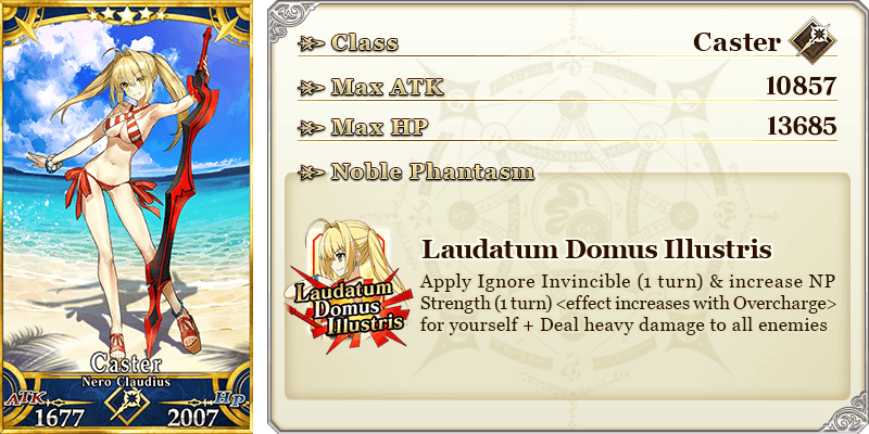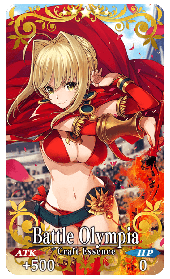 ★★★★★SSR Battle Olympia ATK 500 (MAX: 2000) HP 0 Skill Increase Arts & Buster Card effectiveness by 8% & begin battle with NP charged at 50% for yourself + Increase Nero Medal (Gold) amount per drop by 1 [Event Only]
