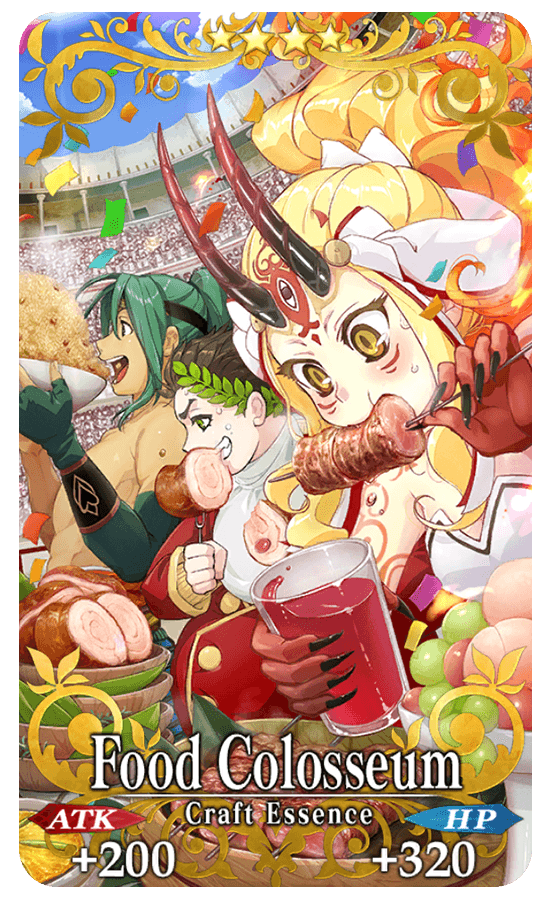 ★★★★SR Food Colosseum ATK 200 (MAX: 750) HP 320 (MAX: 1200) Skill Increase Quick Card effectiveness by 10% & HP Recovery amount by 10% for yourself + Increase Nero Medal (Silver) amount per drop by 1 [Event Only]