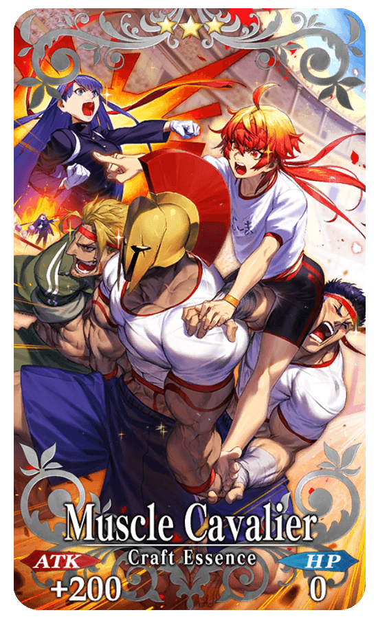 ★★★R Muscle Cavalier ATK 200 (MAX: 1000) HP 0 Skill Increase Buster Card effectiveness by 3% & Critical Strength by 8% for yourself + Increase Nero Medal (Bronze) amount per drop by 1 [Event Only] ![]() |