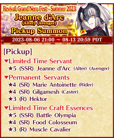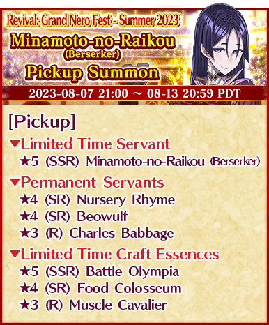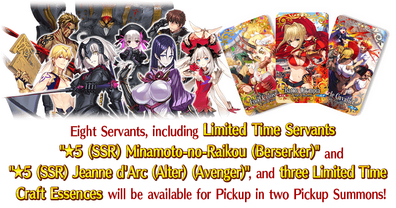 Eight Servants from Limited Time Event "Revival: Grand Nero Fest - Summer 2023", including "★5 (SSR) Minamoto-no-Raikou (Berserker)" and "★5 (SSR) Jeanne d'Arc (Alter) (Avenger)", and three Limited Time Craft Essences will be available for Pickup in two Pickup Summons!