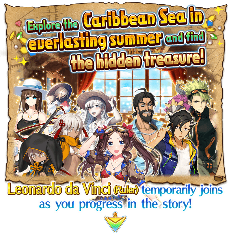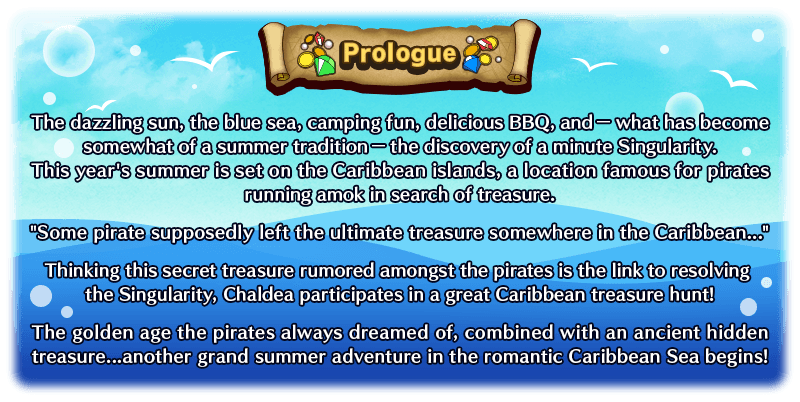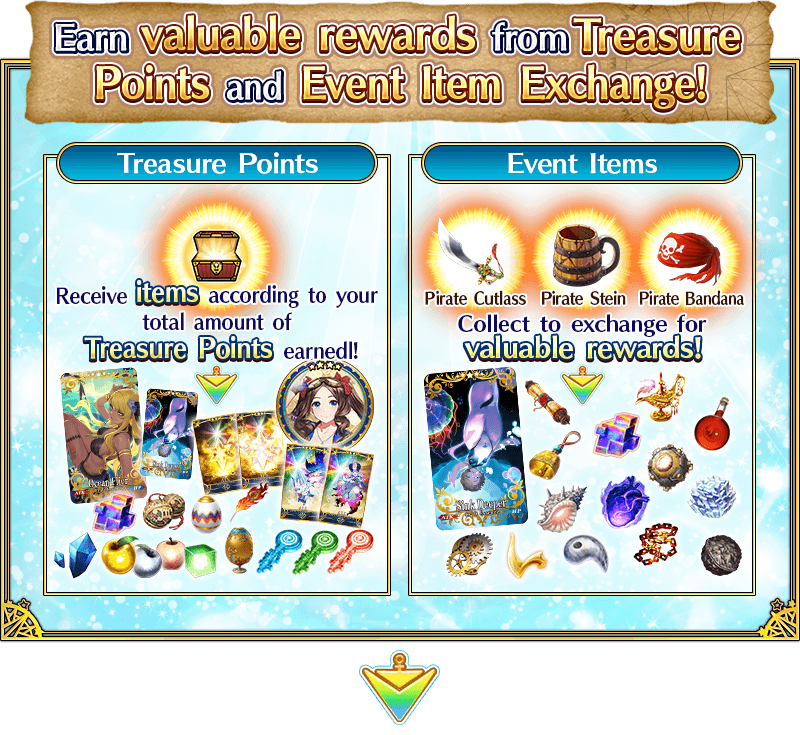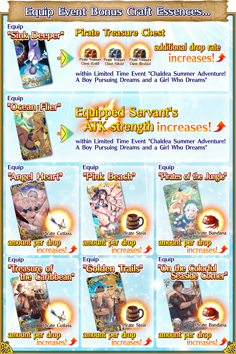In addition, Servants equipped with the Limited Time Craft Essences "★5 (SSR) Angel Heart", "★5 (SSR) Treasure of the Caribbean", "★4 (SR) Pink Beach", "★4 (SR) Golden Trails", "★3 (R) Pirates of the Jungle", and "★3 (R) On the Colorful Seaside Corner", available through the ongoing Pickup Summons, will receive a bonus to the amount per drop of event items "Pirate Cutlass", "Pirate Stein", and "Pirate Bandana".