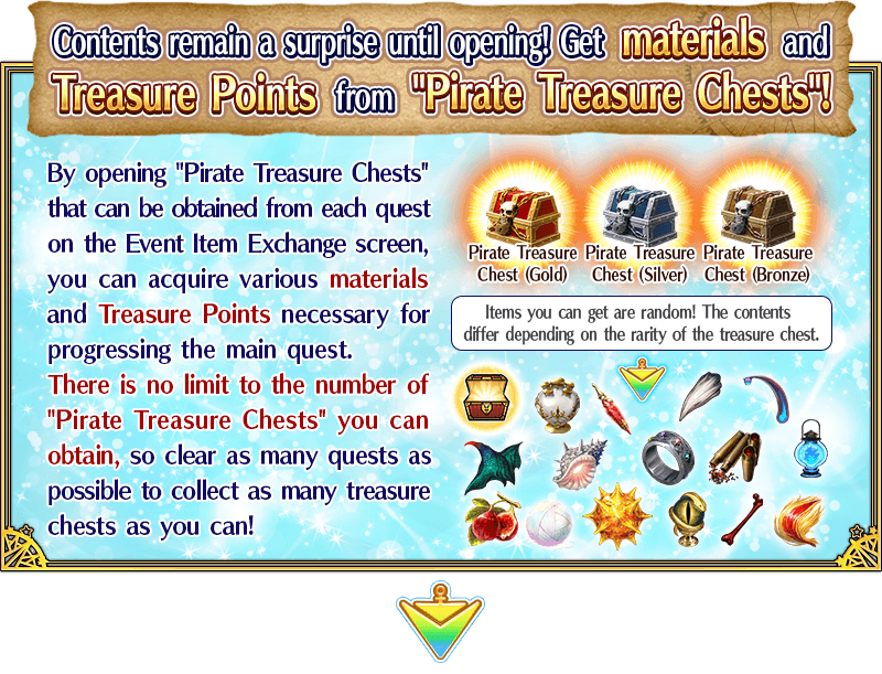 * Rewards obtainable by opening "Pirate Treasure Chests" are selected randomly from the rewards lineup in each treasure chest. * Even if a reward is displayed in the "Treasure Chest Details", you may not be able to obtain all of the rewards with one opening.