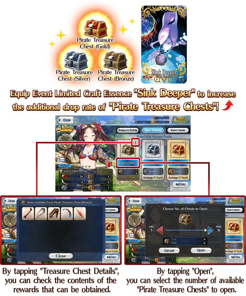 Equip the Event Limited Craft Essence "★5 (SSR) Sink Deeper", available as Treasure Point Rewards and through Event Item Exchange, to increase the additional drop rate of the three types of "Pirate Treasure Chests" within the Limited Time Event "Chaldea Summer Adventure! A Boy Pursuing Dreams and a Girl Who Dreams"!