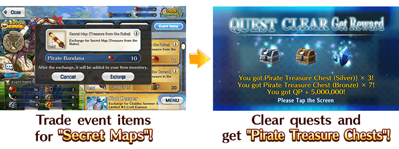 By exchanging "Secret Maps" in Event Item Exchange, "Hidden Treasure Quests" will be unlocked on the event map.