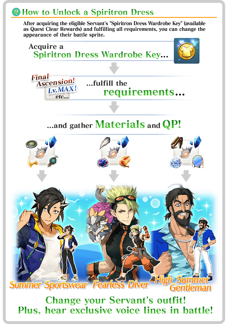 * Upon unlocking a Spiritron Dress, the Servant's battle sprite and icons will automatically be changed. You can revert back to the original appearance or change to a different Ascension level from the Servant Details screen.