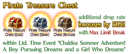 Enemies that appear in the Main Quests and Free Quests of the Limited Time Event "Chaldea Summer Adventure! A Boy Pursuing Dreams and a Girl Who Dreams" may drop "Pirate Treasure Chests" when defeated.