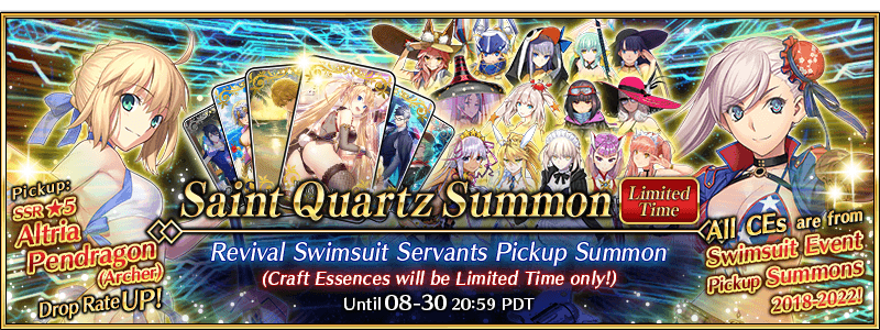 In addition, the following 30 Limited Time Craft Essences originally available in the 2018-2022 Limited Time Summer Events will be the only Craft Essences summonable in the "Revival Swimsuit Servants Pickup Summon"!