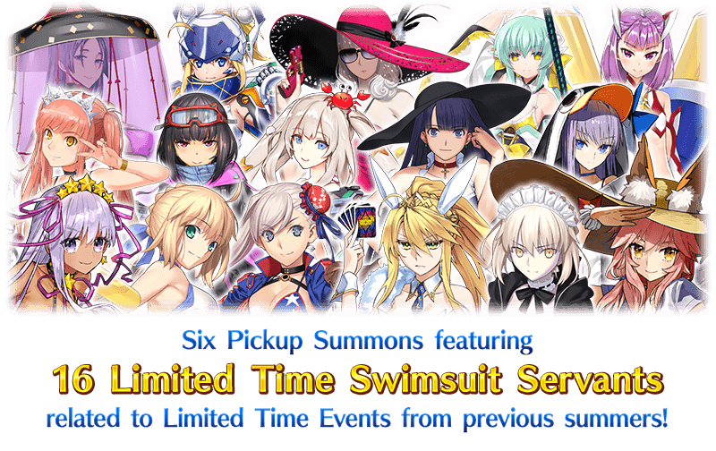 Six Pickup Summons will feature 16 Limited Time Swimsuit Servants related to past summer Limited Time Events!