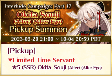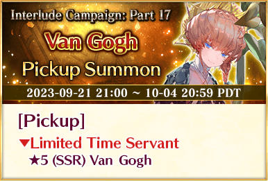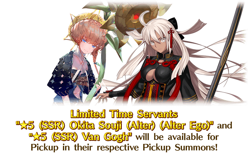 Limited Time Servants "★5 (SSR) Okita Souji (Alter) (Alter Ego)" and "★5 (SSR) Van Gogh" from "Interlude Campaign: Part 17" will be available for Pickup in two Pickup Summons!