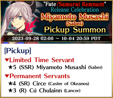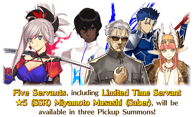 To celebrate the release of "Fate/Samurai Remnant", five related Servants, including Limited Time Servant "★5 (SSR) Miyamoto Musashi (Saber)", will be available for Pickup in three Summons!