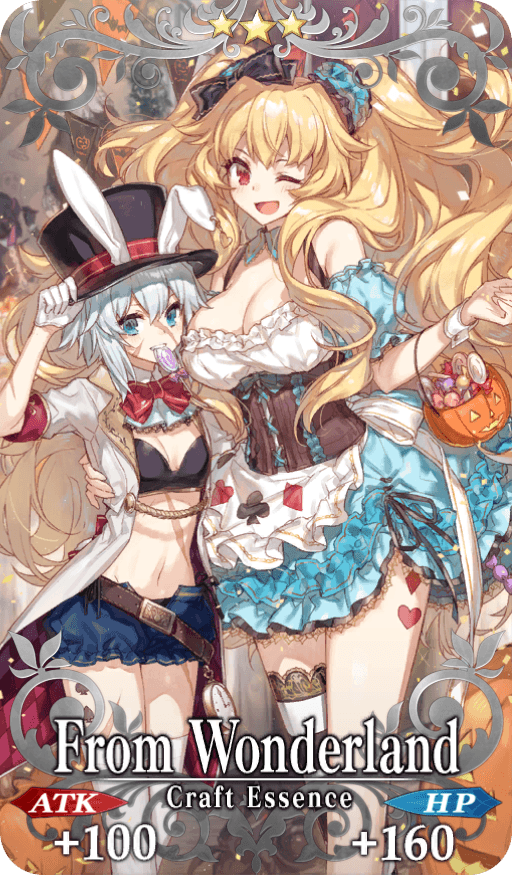 ★★★R From Wonderland ATK 100 (MAX: 500) HP 160 (MAX: 800) Skill Increase Quick Card & Buster Card effectiveness by 4% for yourself |