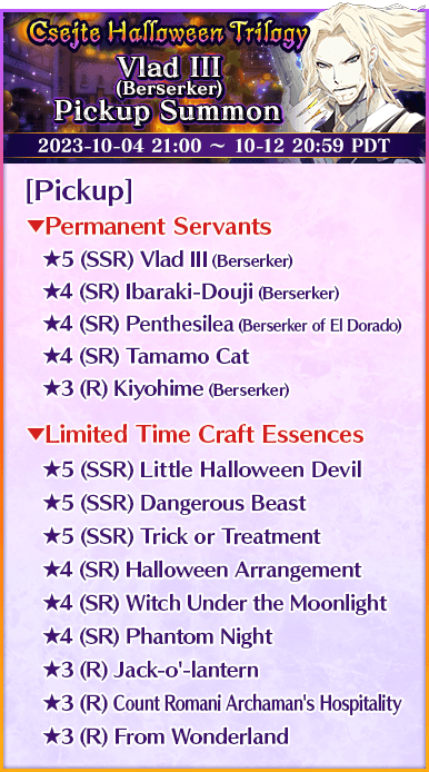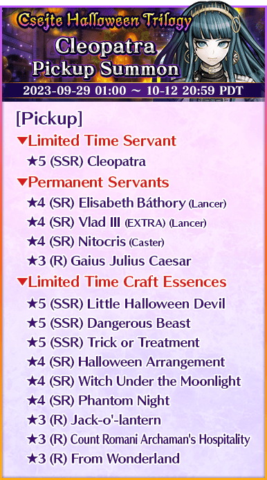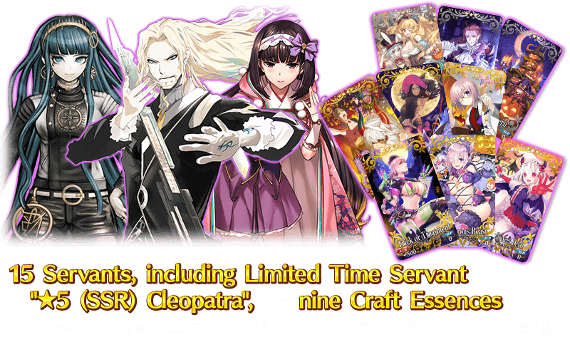 Fifteen Servants from Limited Time Event "Csejte Halloween Trilogy: Ultra Deluxe Highlights!", including Limited Time Servant "★5 (SSR) Cleopatra", and nine Limited Craft Essences will be available in three Pickup Summons!