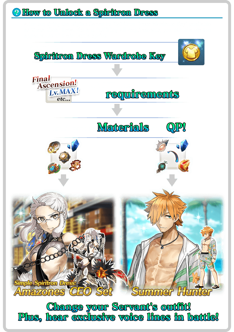 About the Spiritron Dress Wardrobe Keys: * The Simple Spiritron Dress "Amazones CEO Set" and the Spiritron Dress "Summer Hunter" will change the appearance and some voice lines for "4 (SR) Penthesilea (Berserker of El Dorado)" and "★3 (R) Robin Hood", respectively. * Unlock Wardrobe can be performed for "★4 (SR) Penthesilea (Berserker of El Dorado)" even if you have not yet revealed her True Name. * If you do not own "★4 (SR) Penthesilea (Berserker of El Dorado)" or "★3 (R) Robin Hood", you can still acquire their Spiritron Dress Wardrobe Keys, but you will not be able to unlock them.