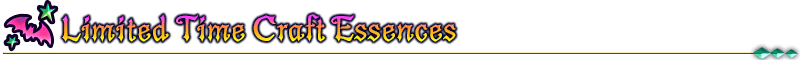 About Featured Craft Essences: * The Limited Time Craft Essences available through this summon do not grant an Event Bonus during the Limited Time Event "Csejte Halloween Trilogy: Ultra Deluxe Highlights!". * The following Craft Essence(s) will also be available from Friend Point Summon for the duration of the Pickup Summon period. - ★3 (R) Jack-o'-lantern - ★3 (R) Count Romani Archaman's Hospitality - ★3 (R) From Wonderland * The following Craft Essence(s) will be automatically burned if you have ★3 Craft Essences included in your Automatic Burning settings. Please check your settings before summoning. - ★3 (R) Jack-o'-lantern - ★3 (R) Count Romani Archaman's Hospitality - ★3 (R) From Wonderland