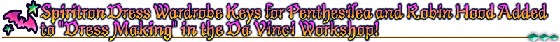 The Simple Spiritron Dress "Amazones CEO Set" for "★4 (SR) Penthesilea (Berserker of El Dorado)" and the Spiritron Dress "Summer Hunter" for "★3 (R) Robin Hood" will be added to "Dress Making" in the Da Vinci Workshop! Exchange Rare Prisms to get the above Spiritron Dress Wardrobe Keys.