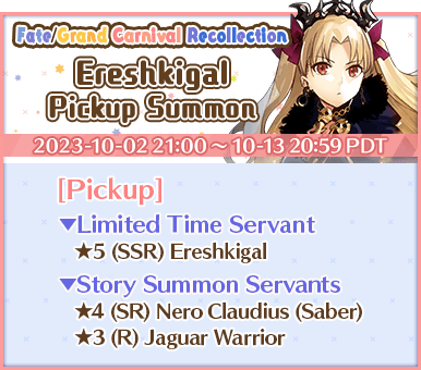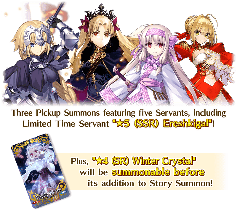 Five Servants will be featured in three Pickup Summons, including Limited Time Servant "★5 (SSR) Ereshkigal"!