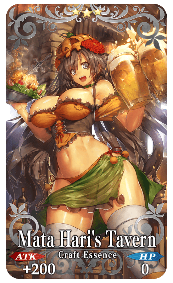 ★★★R Mata Hari's Tavern ATK 200 (MAX: 1000) HP 0 Skill Increase Quick Card & Arts Card & Buster Card effectiveness by 2% & Critical Strength by 5% for yourself |