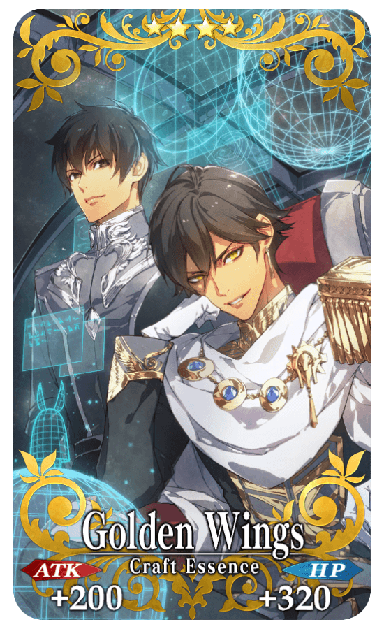 ★★★★SR Golden Wings ATK 200 (MAX: 750) HP 320 (MAX: 1200) Skill Increase NP Strength by 20% & NP Gain by 5% for yourself |