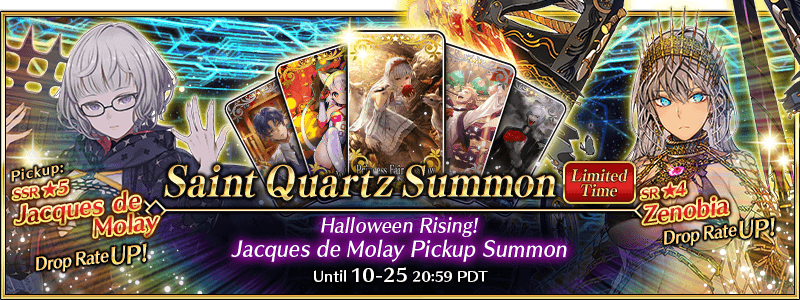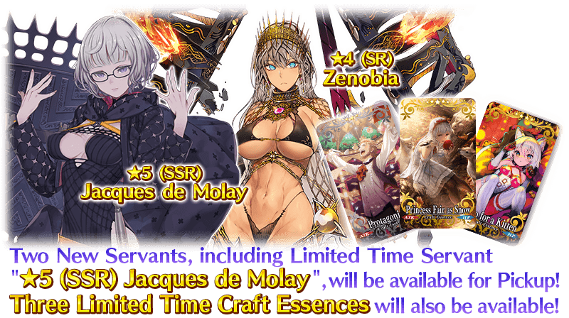 Two new Servants from Limited Time Event "Halloween Rising! The Queen of Dust and the Disciple of Darkness", including Limited Time Servant "★5 (SSR) Jacques de Molay", and three Limited Time Craft Essences will be available for Pickup!