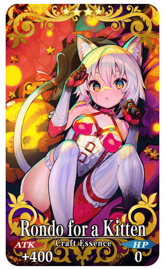 ★★★★SR Rondo for a Kitten ATK 400 (MAX: 1500) HP 0 Skill Increase Quick Card effectiveness by 8% & Critical Strength by 8% & NP Gain by 8% for yourself + Increase Gingerbread Houses amount per drop by 1 [Event Only]