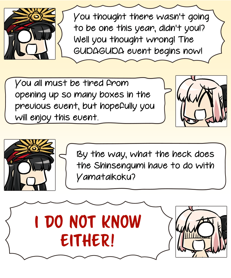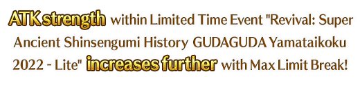 * In-game graphics may vary from the images used within this article. * This event is a "Revival - Lite" version of the 2022 Limited Time Event "Super Ancient Shinsengumi History GUDAGUDA Yamataikoku 2022". Certain elements have been adjusted for a more enjoyable experience. * Certain quests will be unlocked at a later date.