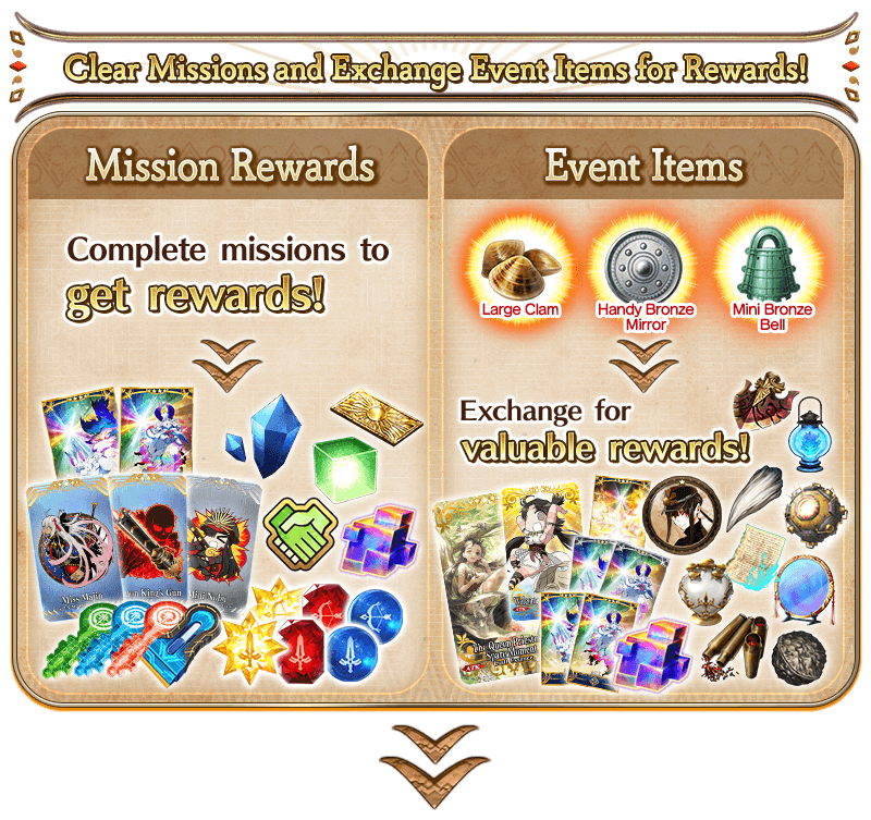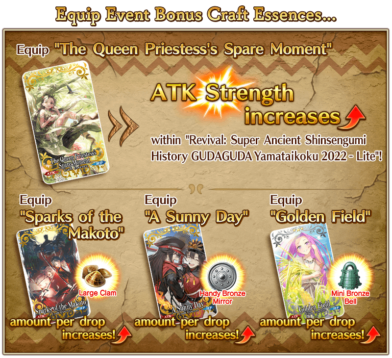 Equip the Limited Time Craft Essences "★5 (SSR) Sparks of the Makoto", "★4 (SR) A Sunny Day", and "★3 (R) Golden Field", available through the ongoing Saint Quartz Summon, to receive a bonus to the amount per drop of event items ”Large Clam”, “Handy Bronze Mirror”, and “Mini Bronze Bell”.