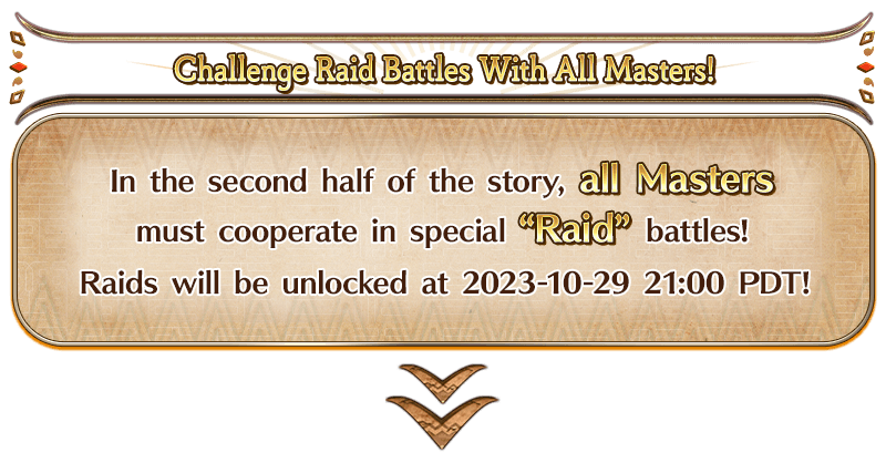 Enjoy the story through Main Quests that will be released at specific dates, then work together with all Masters participating in the event to challenge a powerful enemy in unique quests that will be unlocked at 2023-10-29 21:00 PDT (GMT -7)!