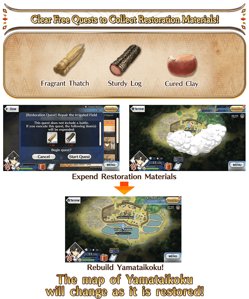 Expend the restoration materials "Fragrant Thatch", "Sturdy Log" and "Cured Clay", gained by completing Free Quests, to complete Restoration Quests and restore Yamataikoku.