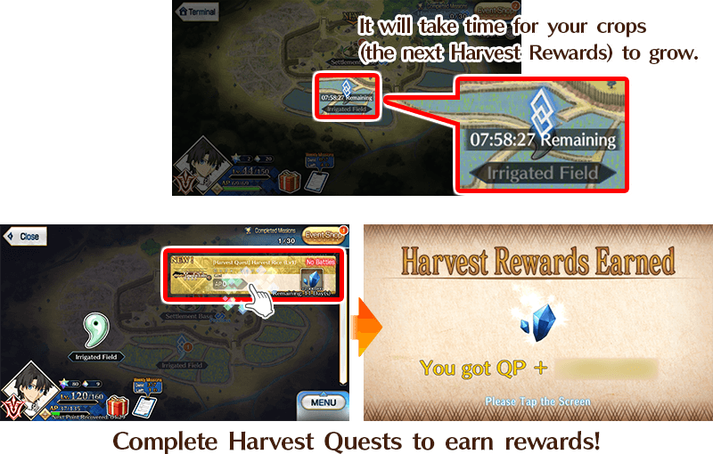 As you progress in the scenario and begin restoring Yamataikoku, Harvest Quests will appear. Harvest Quests can be cleared multiple times at set intervals for rewards such as Friend Points and QP.