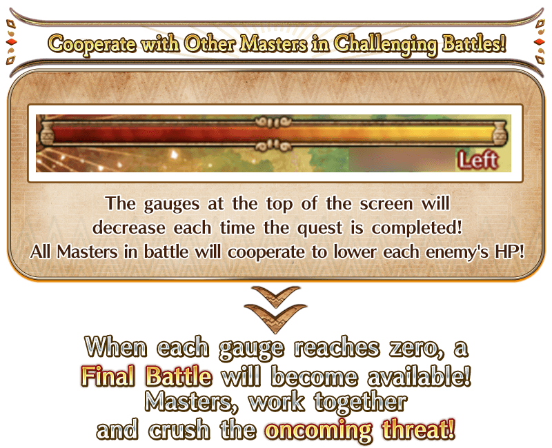 Enemy gauges are shared by all Masters, so cooperate with other Masters to reduce the gauges by challenging battles multiple times. Deplete the gauge entirely to repel the enemy.