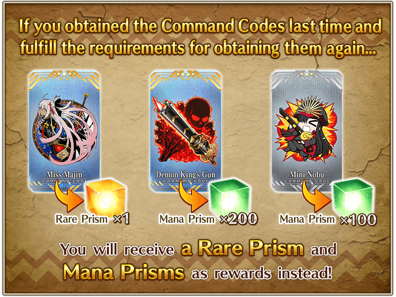 - If you already claimed a "Command Code" as a Mission Reward in the original event, the equivalent reward for completing that specific mission will be a Rare Prism or Mana Prisms.