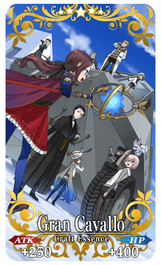 ★★★★★SSR Gran Cavallo ATK 250 (MAX: 1000) HP 400 (MAX: 1600) Skill Increase Bond gained when completing quests by 1% & increase Mystic Code EXP gained by 1% |