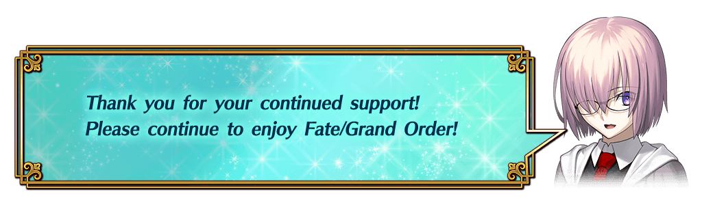 * Please note that Servant Skill Enhancement, Ascension (Servant Evolution), Bond Level Limit Release, Command Code Engraving, Command Card Enhancement, Servant Noble Phantasm Enhancement, Palingenesis, and Unlock Wardrobe will not be eligible for this campaign.