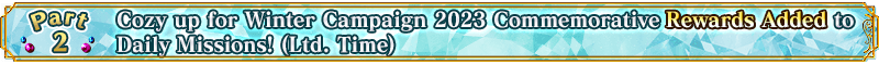 * These missions are separate from the daily Master Missions that are updated every day. If you do not claim the rewards by the end of the Rewards Claimable Period listed above, they will no longer be available. * Please note that it will not be possible to complete "[Cozy up for Winter Campaign 2023] Missions" after the Mission Period has ended. * "[Cozy up for Winter Campaign 2023] Missions" will not be counted towards weekly Master Mission progress. * Please note that the Mission Period and Rewards Claimable Period will differ.