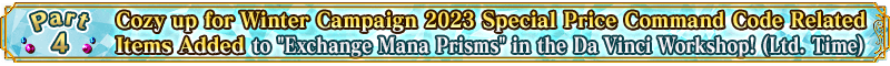 To celebrate the release of "Cozy up for Winter Campaign 2023", the following Command Codes have been added permanently to "Exchange Mana Prisms" and "Exchange Rare Prisms" within the Da Vinci Workshop.