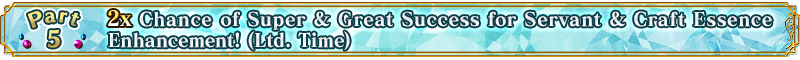 The chance of Super Success (double EXP acquired) and Great Success (triple EXP acquired) when performing Servant and Craft Essence Enhancement will be doubled for a limited time!