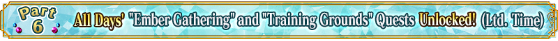 All days' "Ember Gathering" and "Training Ground" Daily Quests in Chaldea Gate will be unlocked at once for a limited time.