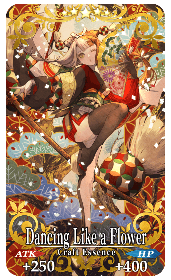 Equip Event Limited Craft Essence "★5 (SSR) Dancing Like a Flower", available through Event Item Exchange, to gain an ATK bonus for the equipped Servant during the Limited Time Event "Showa Kishin Project: GUDAGUDA Ryouma's Narrow Escape! The Mystery of the Disappearing Nobbu Head".