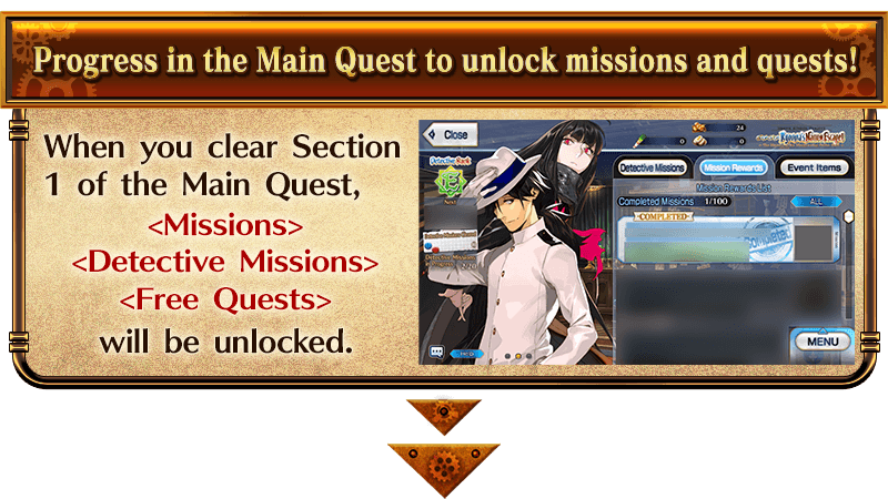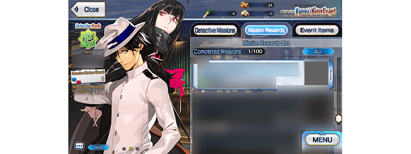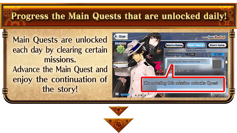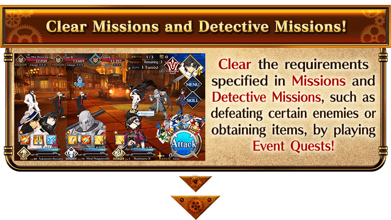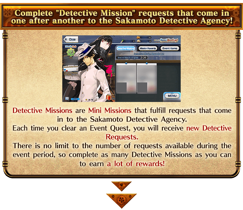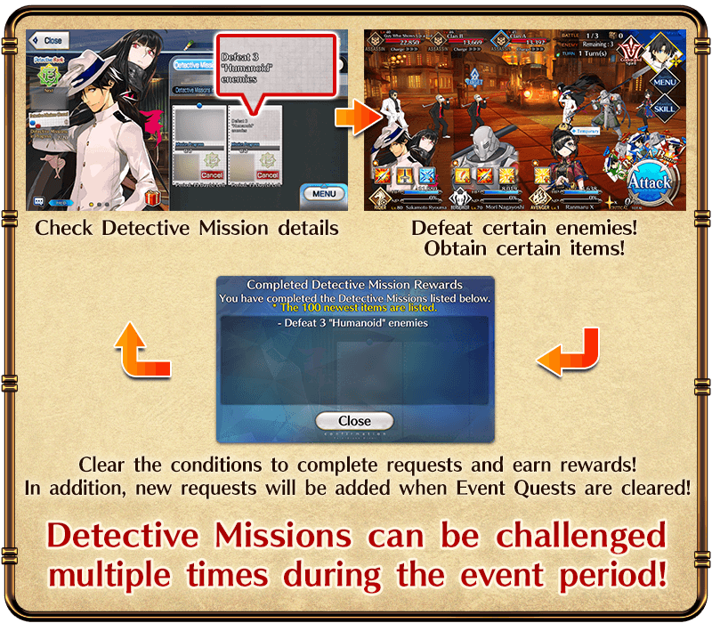 Enjoy the Story in the Main Quests, which will be unlocked daily as long as you have completed certain missions. Clear the Main Quest to permanently add Event Limited Servant "★4 (SR) Mysterious Ranmaru X" to your roster. In addition, as you progress through the Main Quest, new Free Quests will be added, and the difficulty and rewards of Detective Missions will increase.