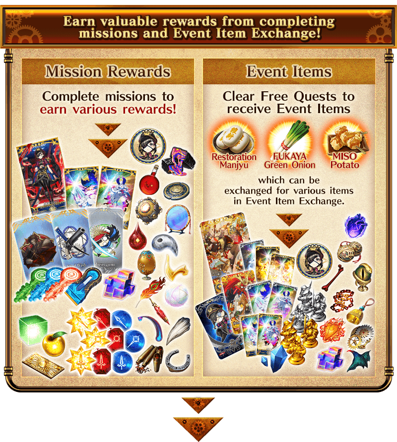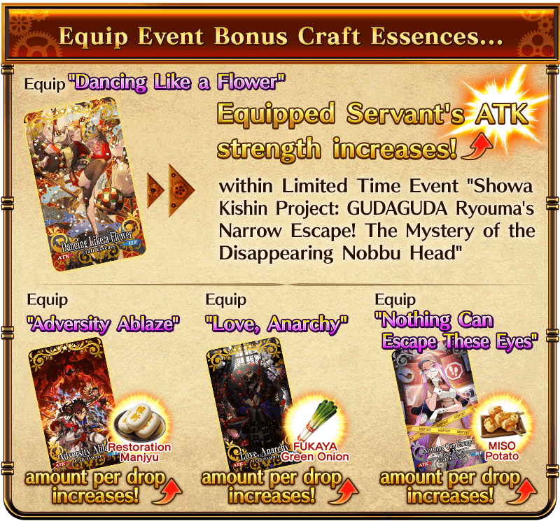 Equip the Limited Time Craft Essences "★5 (SSR) Adversity Ablaze", "★4 (SR) Love, Anarchy", and "★3 (R) Nothing Can Escape These Eyes", available through the ongoing Saint Quartz Summon, to receive a bonus to the amount per drop of event items "Restoration Manjyu", "FUKAYA Green Onion", and "MISO Potato".