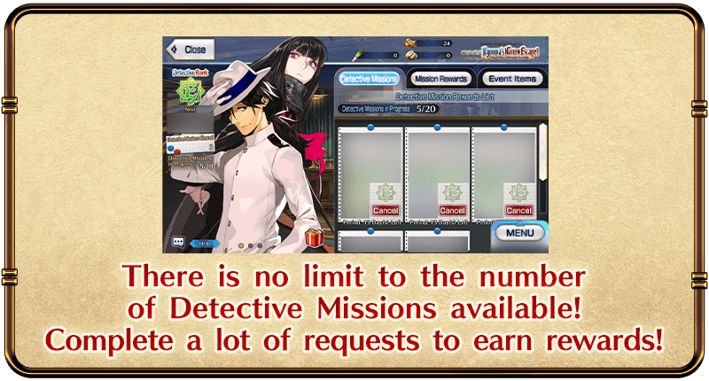 "Detective Missions" are Mini Missions where you can earn various rewards by completing requests that come one after another. There is no limit to the total number of requests you can take on during the event period, so the more requests you complete, the more rewards you can receive.