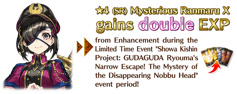 For the duration of the event period, "★4 (SR) Mysterious Ranmaru X" will receive double EXP when performing Enhancement.