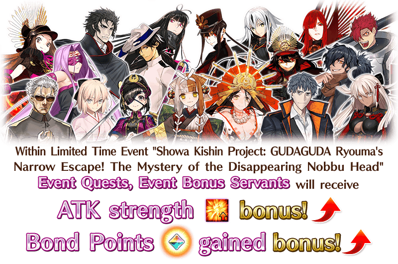 The Servants listed below will receive an "ATK Strength" bonus and a "Bond Points Gained" bonus during this event!